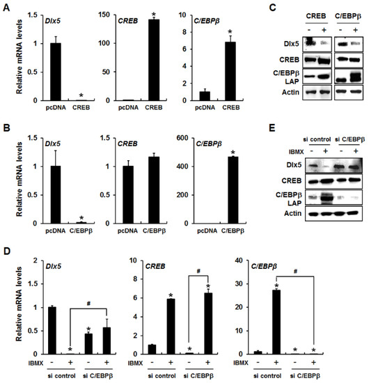 IBMX-induced Dlx5 suppression via upregulation of CREB and subsequent C/EBPβ expression. Overexpression of CREB or C/EBPβ inhibits Dlx5 expression in 3T3-L1 cells. 3T3-L1 cells were transfected with either control (pcDNA), CREB, or C/EBPβ expression vectors and allowed to express for 24 h. Then, the mRNA and protein levels of Dlx5, CREB, and C/EBPβ were analyzed by quantitative RT-PCR (A,B) and Western blot (C), respectively. In IBMX-treated 3T3-L1 preadipocytes, knockdown of C/EBPβ by siRNA rescued the expression of Dlx5 at both the mRNA (D) and protein (E) levels. C/EBPβ knockdown did not exert any effect on IBMX-induced CREB expression. Data represent the mean ± SD (* p < 0.05, compared to control, pcDNA, and si control, # p < 0.05, compared between IBMX-treated groups in the presence or absence of suppression of C/EBPβ by siRNA).