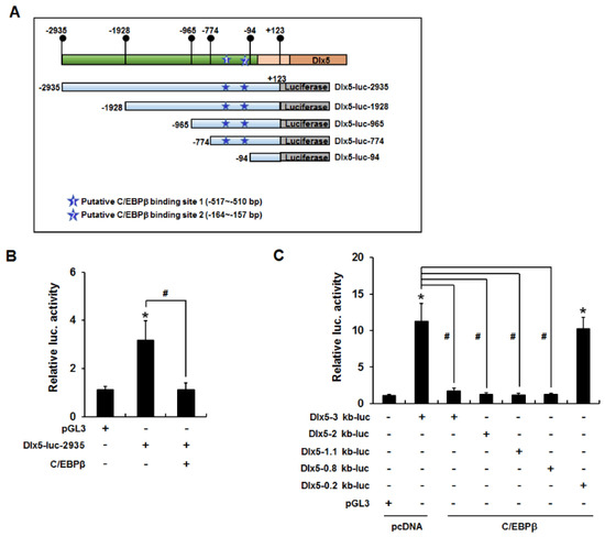 2.3. C/EBPβ Binds to the Dlx5 Promoter and Suppresses Dlx5 Transcription