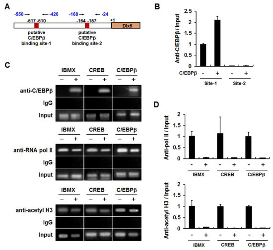 We then investigated whether the Dlx5 promoter region (−774 to −95 bp) contains putative C/EBPβ binding elements. As depicted in Figure 4A, there were two putative C/EBPβ binding elements (site-1: −517 to −510 bp and site-2: −164 to −157 bp), which were predicted as putative C/EBPβ binding sites based on the transcription factor binding site search tools, TESS and PROMO. Therefore, we performed ChIP assays to determine whether C/EBPβ interacts with these putative binding sites. The nuclear extracts from cells transiently transfected with pcDNA or C/EBPβ expression plasmids were used for immunoprecipitation with anti-C/EBPβ antibodies. Quantitative PCR of the Dlx5 promoter regions demonstrated that the relative ratio of C/EBPβ antibody bound fraction to input in the C/EBPβ binding site-2 was less than 3% of that of the C/EBPβ binding site-1 (Figure 5B). Furthermore, overexpression of C/EBPβ increased the C/EBPβ antibody bound fraction to the C/EBPβ binding site-1 but not the C/EBPβ binding site-2. Therefore, we ruled out the putative C/EBPβ binding site-2 and performed further ChIP experiments targeting the C/EBPβ binding site-1. The 3T3-L1 cells were treated with IBMX for 24 h or transiently transfected with CREB or C/EBPβ expression plasmid. PCR amplification of the Dlx5 promoter region encompassing the C/EBPβ binding site-1 demonstrated that IBMX treatment or overexpression of CREB or C/EBPβ clearly increased C/EBPβ binding to the site-1 Dlx5 promoter region (Figure 5C). ChIP specificity was supported by showing that PCR products were not detected in the samples immunoprecipitated with IgG control.