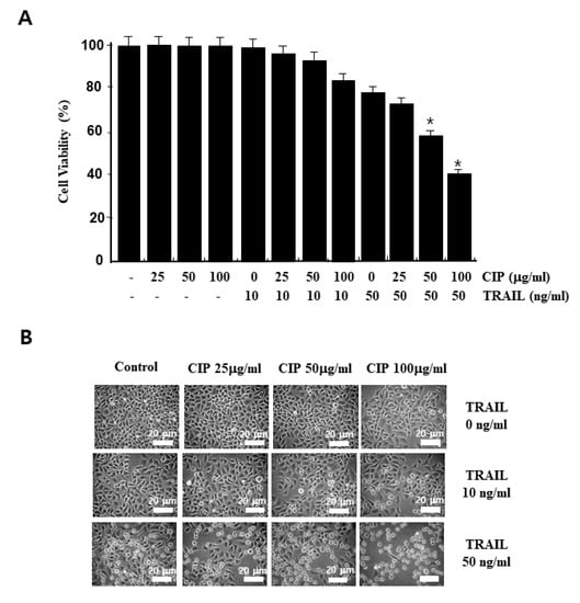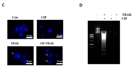 To investigate the effect of CIP on TRAIL-induced apoptosis, A549 cells were exposed to 10 to 50 ng/mL of TRAIL with or without CIP at various concentrations. Neither CIP nor TRAIL alone had any effect on cell death, but combined treatment with both CIP and TRAIL markedly enhanced cell death in a dose-dependent manner and also induced morphological changes in the cells (Figure 1A,B). Next, we examined whether combined treatment with CIP and TRAIL induces DNA fragmentation. In the cells that received the combined treatment with CIP and TRAIL, we detected the typical apoptotic nuclei (Figure 1C) and analyzed the DNA fragmentation (Figure 1D). These data indicated that combined treatment with CIP- and TRAIL-induced cell death in human lung cancer cells.