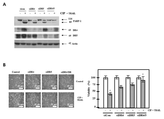 Effect of death receptors knockdown on CIP-induced sensitization to TRAIL. (A) A549 cells were transfected with DR5 siRNA, DR4 siRNA, and combined DR5 and DR4 siRNA. After 48 h, the cells were pretreated with CIP for 20 h and then treated with TRAIL for 4 h. Whole cell extracts were analyzed by western blotting using antibodies against PARP, DR4, and DR5. (B) Cell death was determined by Annexin V/PI staining. Scale bar = 20 μm. The bar represents the mean ± SD. * p < 0.01 indicates a significant difference between the untreated control and CIP + TRAIL-treated samples.