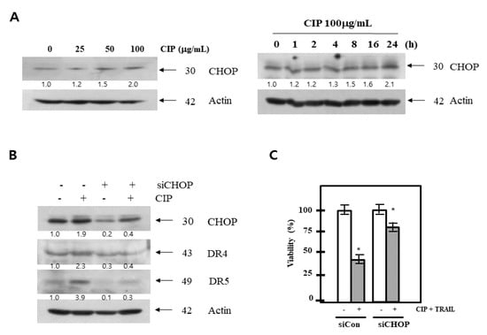 CIP exposure led to the regulation of CHOP proteins expression. (A) The effects of CIP on the expression levels of CHOP proteins. A549 cells were treated with various concentrations of CIP. Equal amounts (40 µg) of cell lysates were separated by SDS-PAGE. The images shown are representatives of two additional experiments which yielded similar results. (B) A549 cells were transfected with CHOP siRNA. After 48 h, the cells were pretreated with CIP for 24 h. Whole cell extracts were analyzed by western blotting using antibodies against CHOP, DR4, and DR5. (C) A549 cells were transfected with CHOP siRNA. After 48 h, cells were treated with CIP + TRAIL for 24 h. Cell death was determined by Annexin V/PI staining. The bar represents the mean ± SD. * p < 0.01 indicates a significant difference between the untreated group and CIP + TRAIL-treated samples.
