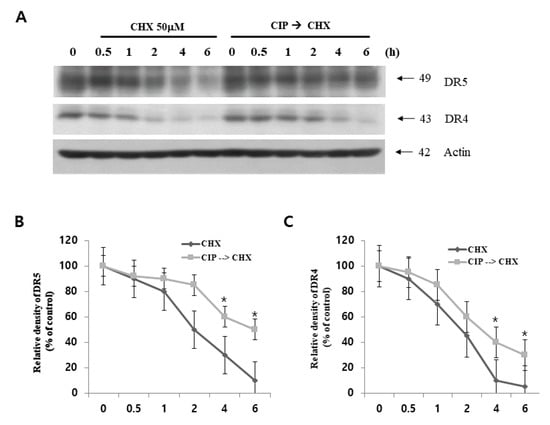 Effect of CIP on DR4 and DR5 protein stability. (A) A549 cells were treated with or without CIP for 24 h in the presence or absence of CHX for the indicated time periods. DR5, DR4, and actin protein levels were determined by western blotting. Actin was used as a loading control. The band intensity of DR5 (B) and DR4 (C) proteins was measured using the public domain JAVA image-processing program Image J. Each value represents the mean ± SD of three independent experiments. * p < 0.05 compared to that of CHX.
