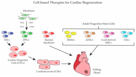 Cell-based Therapies for cardiac regeneration. Several populations of stem cells were used for cardiac regeneration. ESCs and iPSCs were first differentiated to CPCs and/or to CMs before transplantation, whereas skeletal myoblasts and adult stem cells—such as BMSCs, ADSCs, cord-derived MSCs, and CSCs—were directly employed to regenerate heart.