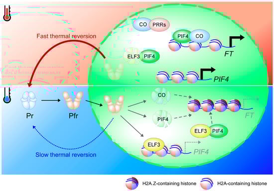 Mechanism of ambient temperature-responsive flowering involving histone variant eviction, phytochromes, and the circadian clock. At high ambient temperatures (red thermometer), H2A.Z is evicted and replaced by the canonical histone H2A. This facilitates the binding of PIF4 and CO to the FT promoter and activation of the transcription of FT. Fast thermal reversion of phyB at warm temperatures (bold red arrow) allows stabilization of CO and PIF4 to maintain robust FT expression. CO protein is stabilized by interacting with PRRs, which are circadian clock components, while the degradation of ELF3 by PIF4 alleviates the repression of PIF4. By contrast, at low ambient temperature (blue thermometer), H2A.Z is present in the FT promoter, blocking the access of transcription factors to the FT promoter. Slow thermal reversion (dashed blue arrow) of phyB at low temperatures induces the degradation of CO and PIF4 proteins, but maintains the stability of ELF3 to repress PIF4. ELF3 also likely blocks the function of PIF4 by direct interaction. Fragmented ovals indicate degraded proteins. Arrows and dashed arrows in the nucleus denote activation and inability to activate, respectively.