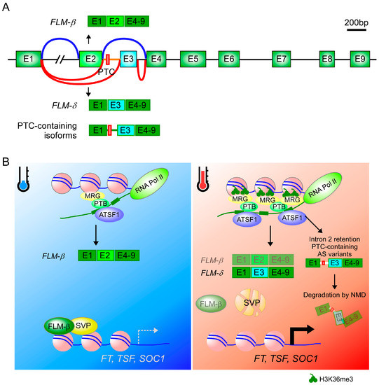 Interestingly, Sureshkumar and colleagues showed that high ambient temperatures downregulate FLM expression by alternative splicing coupled with nonsense-mediated mRNA decay (AS-NMD) [56]. They identified at least 39 thermosensitive splice variants from the FLM locus at high ambient temperature (27 °C) [56,143]. Most of them contain a PTC in intron 2 and they are cleared out by the NMD pathway [145], which seems to be important to regulate overall FLM expression [56] (Figure 2A,B). FLM expression levels were significantly higher in the NMD-impaired upf mutants compared to wild-type plants, suggesting that NMD is indeed involved in the post-transcriptional repression of FLM. However, the exact molecular mechanisms underlying how alternative splicing senses elevated ambient temperatures and how the splicing machinery conveys the “message” by reducing fidelity of splice site recognition and/or usage to make faulty transcripts are yet to be elucidated.
