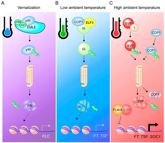 FRIGIDA (FRI), another flowering time regulator that is important in the vernalization pathway, is degraded via the 26S proteasome system [155]. FRI encodes a coiled-coil protein that induces FLC expression to repress the expression of the flowering pathway integrators FT, SOC1, and LEAFY [156,157,158]. High levels of FLC result in late flowering of the winter Arabidopsis accessions. These natural accessions begin their life cycles during the fall and undergo vegetative growth, then flower during the next spring [159]. By contrast, the summer annual Arabidopsis accessions have low FLC expression levels due to the absence of functional FRI and hence flower early; they complete their life cycles in a single growing season. LIGHT-RESPONSE BTB1 (LRB1) and LRB, two BTB (Bric-a-Brac/Tramtrack/Broad Complex) proteins, along with the CULLIN3A (CUL3A) ubiquitin-E3 ligase directly interact with FRI in vitro and in vivo, leading to proteasomal degradation of FRI during prolonged cold treatment (Figure 3A). This temperature-dependent degradation of FRI leads to the reduction of FLC expression and hence causes early flowering [155].
