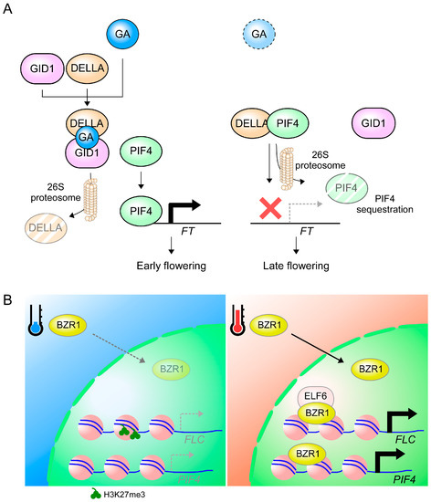 GA signaling is mediated by a class of nuclear-localized proteins, known as DELLAs [232]. The Arabidopsis genome contains five DELLA genes [233] and all these DELLA proteins are regulated post-translationally by different levels of GAs, which triggers degradation of DELLA proteins via the ubiquitin-proteasome system [234]. DELLA proteins physically interact with a number of transcriptional regulators. Such interactions interfere with the DNA-binding capacity of these transcription factors [235]. PIF4, one of the target transcription factors of DELLAs, plays an important role in the activation of FT expression at warm ambient temperature [47,48]. After interacting with DELLA proteins, PIF4 cannot bind to DNA [236,237]. These results suggest that GAs affect thermosensing by modulating DELLA–PIF4 interactions and the interaction with PIF-like transcription factors [238].