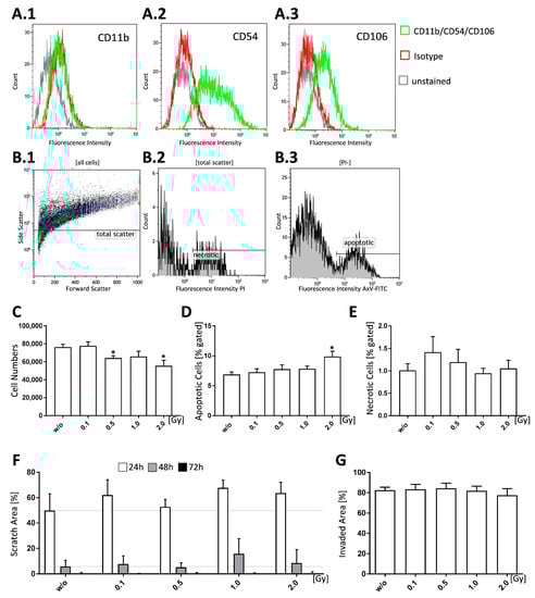 Low doses of ionizing radiation have no significant impact on cell death and migration properties of FLS cultures of healthy mice. Healthy FLS cultures obtained from C57Bl/6 mice were phenotyped at passage 5, seeded and analyzed 96 h after the treatment with low, intermediate, and high doses of ionizing radiation. Cell pools that were tested via flow cytometry were considered to be FLS when being CD11b− (A.1), CD54+ (A.2), and CD106+ (A.3). B.1 to B.3 shows gating strategy for cell death analysis of FLS via flow cytometry. Cell death was determined after staining of the cells (B.1., total scatter) with AxV-FITC/PI (B.2, B.3). Vital cells were defined as AxV−/PI−, necrotic ones as PI+ (B.2, E), and apoptotic cells as AxV+, but PI− (B.3, D). Cell numbers (C) of living FLS were counted using a Neubauer chamber. Cell migration and invasiveness was tested via scratch assay (F) and matrigel invasion assay (G). For the scratch assay, cells were irradiated after a scratch was applied; pictures were taken every 24 h and scratch area was quantified using Tscratch (V1.0, Copyright T.Geback, M.Schulz, Zurich, Switzerland). The initial scratch area was set to 100% and scratch area of the consecutive days was calculated accordingly. For assessment of invasiveness cells were seeded in a matrigel coated transwell, irradiated and incubated for 3 days. Cells were then stained with crystal violet and invaded area was assessed using ImageJ. Depicted is data from one exemplary phenotyping experiment (A.1–3). Data for cell growth (C), cell death (D,E), scratch assay (F), and invasion assay (G) was examined in three independently performed experiments, each being performed in triplicates, whereas, in the case of scratch assay the three same fields of view were captured every time. Data is presented as mean ± SEM and analysed by two-tailed Mann-Whitney-U test in comparison to untreated controls. (*p < 0.05).