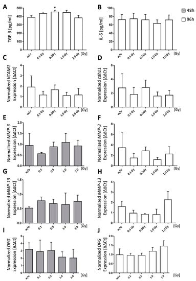 We found expression levels of VCAM1 and cdh11 to be slightly reduced after irradiation with 0.1, 1.0 and 2.0 Gy, whereas no reduction was observed after 0.5 Gy (Figure 2C,D). MMP-3 levels were slightly altered in a time-dependent manner (Figure 2E,F): 48 h after irradiation, MMP-3 expression was slightly reduced at a dose of 0.1 Gy. 96 h after radiation exposure, MMP-3 expression was reduced after irradiation with 0.1 and 1.0 Gy, whereas 0.5 Gy did not impact on its expression. For MMP-13, expression levels slightly rose, independently of the irradiation dose after 48 h (Figure 2G). However, MMP-13 expression was reduced 96 h after irradiation with 0.1, 0.5, or 1.0 Gy (Figure 2H). Regarding OPG expression, altered expression patterns were only observed after exposure to 1.0 and 2.0 Gy: after 48 h, OPG expression was marginally reduced and after 96 h slightly increased (Figure 2I,J). However, none of these alterations significantly differed from mock-treated controls.