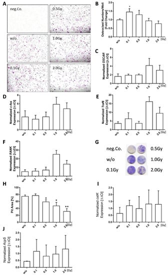 We subsequently aimed to examine whether enhanced osteoclast numbers also lead to increased bone resorption. For this, pit formation assays on bone slices were performed (Figure 3G,H). In contrast to increased numbers of differentiated osteoclasts, we found significantly reduced pit formation starting at a dose of 0.5 Gy (0.5 Gy: p = 0.0221; 1.0 Gy: p = 0.0140; 2.0 Gy: p = 0.0023). Additionally, we checked for gene expression of lytic enzymes Acp5 (Figure 3J) and cathepsin K (catk) (Figure 3I) at the end of the differentiation process (d6). A slight increased gene expression for both enzymes starting already after irradiation with 0.1 Gy was seen.