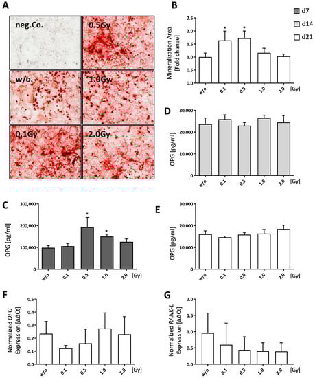 We observed that calvariae-derived osteoblasts showed significantly increased mineralization after exposure to doses of 0.1 Gy (p = 0.0240) or 0.5 Gy (p = 0.0151) (Figure 4A,B). OPG release by osteoblasts was increased only at earlier time point (d7) after exposure to 0.5 Gy (p = 0.0411) or 1.0 Gy (p = 0.0152) (Figure 4C). However, later on (day 14 and day 21), the OPG levels were not significantly altered by radiation exposure (Figure 4D,E).