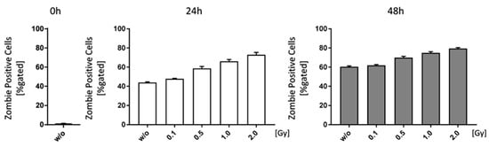 Starting with an irradiation dose of 0.1 Gy, cell death rates in bone marrow cells of C57Bl/6 mice were slightly increased (Figure 5). However, cell death also rose independently of the irradiation (w/o 0 h: 1.36%; w/o 24 h: 43.94%; w/o 96 h: 60.44%), as there were no survival stimuli added to the medium, and in a larger extent than radiation-induced cell death rates (e.g., 2.0 Gy 24 h: 72.85%; 2.0 Gy 48 h 79.45%).