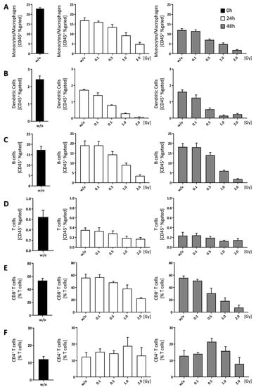 Ionizing radiation alters immune cell composition in bone-marrow of C57Bl/6 mice. Bone-marrow cells were isolated from the long bones of male C57Bl/6 mice. For analyses 1 × 106 cells were seeded in duplicates and analyzed at different time points (0, 24 and 48 h). In order to distinguish live from dead cells a zombie dye (BioLegend, San Diego, CA, USA) was used and the displayed results are all related to living cells. CD45+ cells have then been gated into immune cell subpopulations according to specific surface markers: (A) Monocytes/Macrophages; (B) Dendritic cells; (C) B cells; (D) T cells; T cells have been further classified into CD8+ (E) and CD4+ (F) T cells, respectively. Depicted is joint data from one experiment with three 6 weeks old male mice whose bone-marrow has been analyzed independently and in duplicates. Data is presented as mean ± SEM.