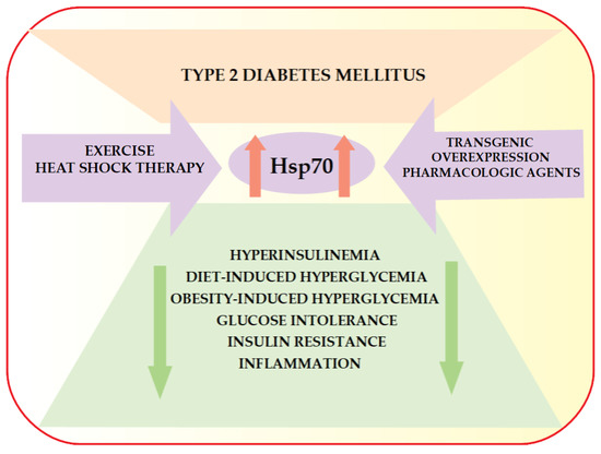 Several studies have already revealed the significant role of HspA1A (Hsp72) in the prevention of hyperinsulinemia and insulin resistance both in animal models of type 2 diabetes mellitus [45,46,47,48,49] and in human type 2 diabetic patients [50] (Figure 1).