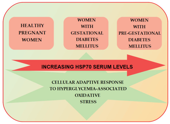 Notably, Garamvölgyi et al. have recently demonstrated that serum Hsp70 concentrations are significantly higher in women with pre-gestational and gestational diabetes mellitus than in healthy pregnant women [36] (Figure 2).