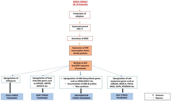 The interactions between abscisic acid (ABA) and ethylene signaling pathways under biotic and abiotic stresses are mediated through Ethylene Response Factors (ERFs).