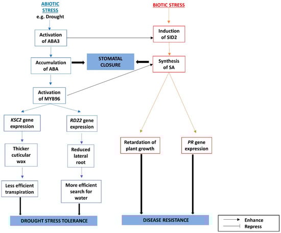 In response to drought stress, ABA promotes cuticular wax biosynthesis mediated by the transcription factor, MYB96, possibly by upregulating the enzyme, 3-ketoacyl-CoA synthase 2 (KCS2), involved in very-long-chain fatty acid biosynthesis in Arabidopsis [97]. MYB96 also increases drought tolerance by upregulating the RD22 gene, which decreases lateral root formation [98]. This phenomenon is accelerated in the super-active myb96-1d mutant, but it is reduced in the less-active myb96-1 mutant [98]. MYB96 also stimulates SA biosynthesis. SA-INDUCTION DEFICIENT 2 (SID2), the gene responsible for expressing isochorismate synthase, a key enzyme in the biosynthesis of SA and normally induced upon infection [99], is found to be upregulated in the super-active myb96-1d mutant. The myb96-1d mutant is more responsive to ABA-mediated signaling, and it also produces higher levels of SA and is more resistant to pathogens, compared to the wild type [100]. These mutant plants have impaired growth similar to those plants with higher levels of ABA. The dwarfism observed in these plants due to the increased ABA-mediated response can be negated by crossing with NahG plants [100], in which NahG encodes SA hydroxylase, which degrades SA [101]. This shows that the dwarfism resulting from response to ABA is actually mediated by SA. On the other hand, the stomatal closure in abiotic and biotic stresses is mediated by ABA and SA, respectively [102,103,104,105].