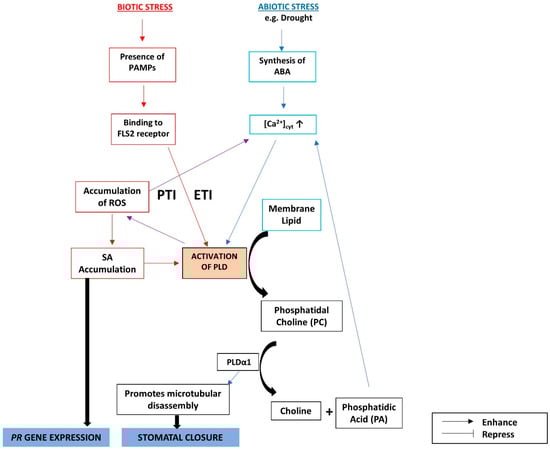 Phospholipid pathways are divided into those that activate phospholipase C (PLC), and those that activate phospholipase D (PLD). Here we will focus on the PLD pathway, which is known to be involved in both abiotic and biotic stresses. There are different genes in the PLD gene family, such as PLDα, β, γ, δ, ε, and ζ, classified into subfamilies [110]. PLDs mediate phosphatidic acid (PA) production, which is a typical response to viral infection, e.g., in tobacco, likely via PLDα and β, since their presence is increased in the leaf upon infection [110,111,112]. PA facilitates viral replication, possibly by aiding in the formation of an active replicase complex [112]. PLDδ was found to provide a cell wall-based defense in Arabidopsis, together with PA, in the case of fungal [112,113] or bacterial [114] infection. PLDs are also reported to participate in abiotic stress responses. For example, PLD α1, α3, and δ cause stomatal closure by inducing the synthesis of PA and the activation of Mitogen-activated Protein Kinase 6 (MPK6), thus increasing tolerance to salt stress [115,116]. Salt increases the PA content in Arabidopsis, which was found to bind to MPK6 and increase its activity. The activation of MPK6 by PA is lost in the pldα1 mutant. MPK6 in turn activates a Na+/H+ antiporter via phosphorylation to confer salt tolerance [117]. PLDδ activity and the concentration of its catalytic product, phosphatidyl alcohols, increased upon dehydration stress; this was absent in Arabidopsis pldδ mutants [118]. PLDδ knockout mutants were found to be more sensitive to freezing stress, having less PA content, while overexpression increased the PA content, as well as conferring resistance [119].