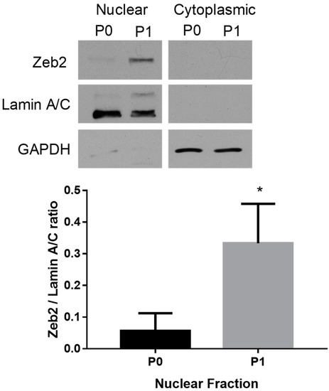 To investigate the role of Zeb2 in regulating fibroblast activation, we first compared the subcellular localization of the Zeb2 protein in P0 rat cardiac fibroblasts and P1 myofibroblasts. By Western blot analysis, we determined that the Zeb2 protein was highly expressed in the nuclei of P1 myofibroblasts versus its expression in the nuclei of P0 fibroblasts (n = 4, p ≤ 0.05) (Figure 1). Zeb2 protein was not detected in the cytoplasmic fractions from either P0 or P1 cells.