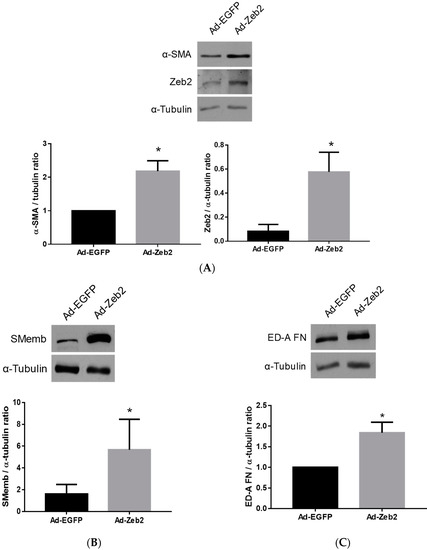 To determine the effects of Zeb2 gain of function on the myofibroblast phenotype, we generated an adenoviral vector encoding Zeb2 (Ad-HA-Zeb2). We were able to achieve a five-fold increase in Zeb2 protein levels by infecting myofibroblasts at a MOI of 200 (Figure 2A). We first examined the effect of ectopic Zeb2 expression on the protein levels of three key markers of the myofibroblast phenotype: α-SMA, SMemb and ED-A fibronectin [28]. Fibroblasts were activated by plating on stiff plastic substrates and transduced with either Ad-EGFP (200 MOI) or Ad-HA-Zeb2 (200 MOI) and incubated for 96 h [29]. Our data shows that Zeb2 overexpression significantly increased the levels of expression of α-SMA (n = 4, * p ≤ 0.05), SMemb (n = 4, * p ≤ 0.05) and ED-A fibronectin (n = 3, * p ≤ 0.05) as compared to the Ad-EGFP infected viral control cells. Expression levels were normalized using α-tubulin as a loading control (Figure 2).
