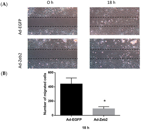 Zeb2 overexpression inhibits the migration of P1 myofibroblasts. (A) P1 myofibroblasts were transduced with Ad-EGFP or Ad-HA-Zeb2 and incubated for 96 h. After 96 h, culture inserts were removed and images were taken at the indicated time points (4× objective). (B) The number of cells in the wounded area was quantified using ImageJ software. Histographic representation shows the number of migrated cells in Ad-EGFP (200 MOI) and Ad-Zeb2 (200 MOI) infected plates. n = 3, * p ≤ 0.05 vs Ad-EGFP at 18 h. Error bars represent SEM. Data were analyzed by performing a Student’s t-test.