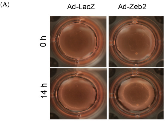 To initiate this assay, 7 mL of cold collagen I solution (Worthington) was mixed with 2 mL of 5× culture medium (DMEM F-12 without serum and antibiotics) in a 50 mL centrifuge tube and the pH was kept between 7 and 7.5. The volume was then adjusted to 10 mL with double-distilled water (ddH2O). After that, 500 µL of the mixture was added per well of a 24-well plate. Gels were allowed to solidify by incubating at 37 °C in a 5% CO2 incubator for minimum 3 h or overnight. P1 myofibroblasts (5 × 104 per well) were then plated onto wells and transduced with either Ad-LacZ (200 MOI) or Ad-HA-Zeb2 (200 MOI) in 10% FBS-containing DMEM-F12 medium. The following day, medium was replaced with 1% FBS-containing DMEM F-12 medium and incubated for another 48 h. After 48 h of incubation, the medium was replaced with serum-free DMEM F-12 medium. Gels were cut around the edges using pipette tips. Images were taken at 0 h and 14 h, and gel surface contraction was measured using IDL Measure Gel software (University of Calgary, Calgary, AB, Canada).