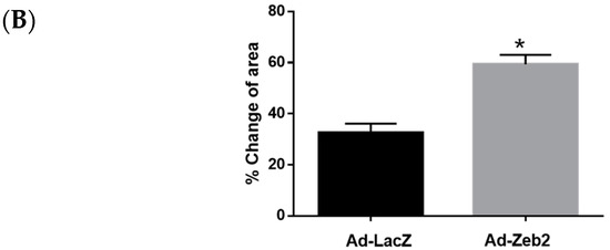 P1 cardiac myofibroblasts (2.5 × 104 cells in 70 µL of 10% FBS-containing DMEM-F12 medium) were plated inside culture inserts (ibidi USA Inc., Madison, WI, USA) and grown overnight in a 5% CO2 incubator at 37 °C. The following day, cells were transduced with either Ad-EGFP (200 MOI) or Ad-HA-Zeb2 (200 MOI) and incubated for 96 h. After 96 h, the culture inserts were carefully removed and cells were washed with 1× PBS and the medium was replaced with 1% FBS-containing DMEM-F12 medium. Images were taken at 0 h and 18 h using a 4× objective. The number of cells in the wounded area was quantified using ImageJ software (version 1.45; National Institutes of Health, Bethesda, MD, USA) [45].