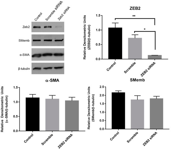 To determine the effect of loss of Zeb2 function on the expression of myofibroblast markers, we knocked down Zeb2 in P1 myofibroblasts and then measured the protein expression of α-SMA and SMemb 24 h later. Transfection with siRNA specific to Zeb2 significantly reduced Zeb2 expression as compared to either control or scramble siRNA controls by 88.1% and 82.3%, respectively (Figure 5). There were no differences detected in the levels of either α-SMA or SMemb between the different groups by Western blot analysis (Figure 5).