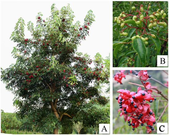 Morphological characteristics of Euscaphis konishii: (A) fruiting plant, (B) young fruits, and (C) opening fruits.