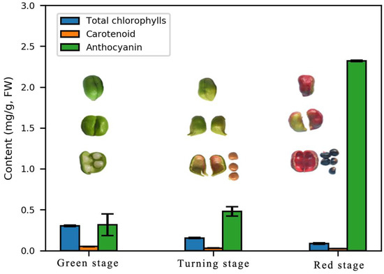 The fruits of E. konishii at three developmental stages and contents for the total chlorophyll, carotenoids, and anthocyanins in the pericarp. Green stage: 50 days after flowering; turning stage: 70 days after flowering; red stage: 115 days after flowering; blue bar: total chlorophylls; orange bar: carotenoids; and green bar: anthocyanin.