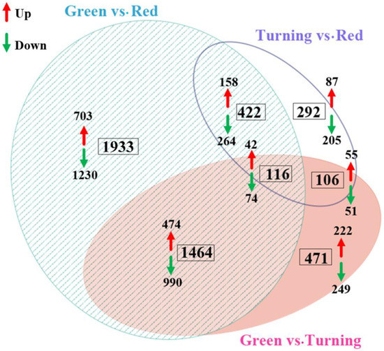 Based on the three comparisons of green vs. turning, green vs. red, and turning vs. red, we identified a total of 4804 differentially expressed genes (DEGs). Among them, 2175 DEGs between green vs. turning, 3935 DEGs between green vs. red, and 936 DEGs between turning vs. red were detected. In order to identify the related genes that are involved in the regulation of endocarp color, the up- and down-regulated genes between the three stages were further analyzed, and the results showed that the down-regulated genes were more abundant than the up-regulated genes in th special DEGs or co-DEGs of the differential stages (Figure 3).