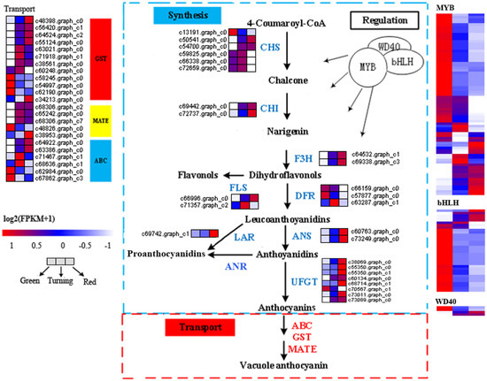 Expression pattern of genes involved in anthocyanin synthesis, regulation, and transport. The value of log2 (FPKM + 1) is represented using the depth of color, with blue representing the up-regulated expression genes and red representing the down-regulated expression genes. FPKM means the fragments per kilobaseof exon per million fragments mapped. CHS—chalcone synthase; CHI—chalcone-flavanone isomerase; F3H—flavanone-3-hydroxylase; DFR—dihydroflavonols 4-reductase; ANS—anthocyanidin synthase; ANR—anthocyanidin reductase; UFGT—UDP (Uridine diphosphate) flavonoid glucosyltransferase; LAR—leucoanthocyanidins reductase; FLS—flavonol synthase; ABC—ATP-binding cassette; GST—glutathione-S-transferase; MATE—multidrug and toxic compound extrusion; MYB—transcription factor MYB; bHLH—basic helix–loop–helix; WD40—WD40 transcription factor.