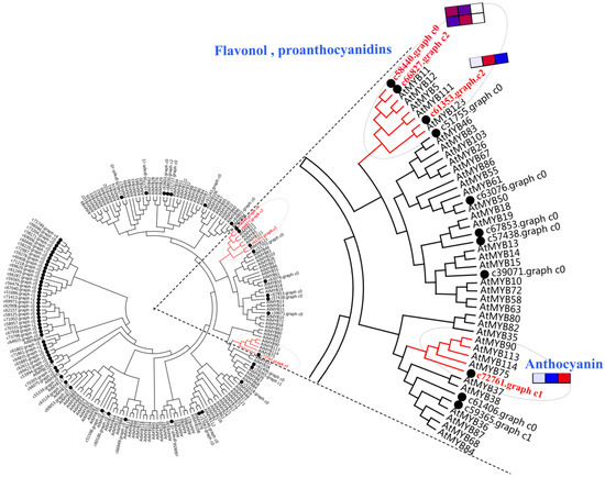 A phylogenetic tree was constructed using 126 Arabidopsis thaliana R2R3-MYB TF family members and candidate E. konishii MYB family members (Figure 5). In this phylogenetic tree, two highly homologous A. thaliana genes (AtMYB11 and AtMYB12), with the function of controlling the flavonol biosynthesis in all tissues [31], were clustered together with c58440.graph_c0 and c66827.graph_c2 genes. Four homologous A. thaliana genes (AtMYB75, AtMYB90, AtMYB113, and AtMYB114), which regulate the anthocyanin biosynthesis in vegetative tissues [32], were clustered closely together with c72761.graph_c1. AtMYB123, which controls the biosynthesis of proanthocyanidins in the seed coat of Arabidopsis, was clustered together with c61353.graph_c2 [33].