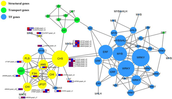 A total of 186 transcription factor genes (TFs), 26 synthesis genes, and 23 transport genes may regulate anthocyanin biosynthesis (all genes are shown in Figure 4 and Table S5) in E. konishii, and were used to construct a protein interaction network by using the String Online Tools (https://string-db.org/). Then, we constructed a co-expression network by using Cytoscape. The results show that a total of 204 genes were determined between 235 genes, and the study identified three modules from the network (Figure 6). Most of the TF and GST transport genes tended to connect up, respectively. With the exception of DFR, the major synthesis genes (including CHS (chalcone synthase), CHI (chalcone isomerase), F3H (flavanone-3-hydroxylase), FLS (flavonol synthase), ANS (leucoanthocyanidin dioxygenase), and UFGT (UDP (Uridine diphosphate)-flavonoid glucosyltransferase)) involved in the anthocyanin biosynthesis closely interacted with each other. One candidate transport gene (GST, c48398.graph-c0) and two transcription factors (MYB12, c58440.graph-c0; MYB113, c72761.graph-c1) strongly interacted with the structure of the genes. The down-regulated DFR (c57877.graph_c0) interacted with two down-regulated MYB genes (c51686.graph_c0 and c63076.graph_c0).