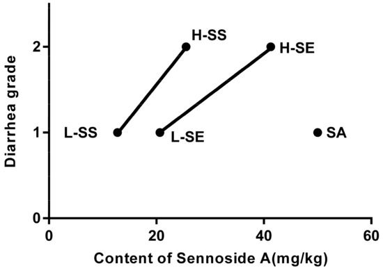 The diarrhea grade in the rats treated with a low dose of senna extract (L-SE), high dose of senna extract (H-SE), low dose of sennosides (L-SS), high dose of sennosides (H-SS), and sennoside A (SA) for over six days. The horizontal axis represents the content of sennoside A in each administration. The vertical axis depicts the diarrhea grade (1, 2 refers to loose stool and watery diarrhea, respectively).