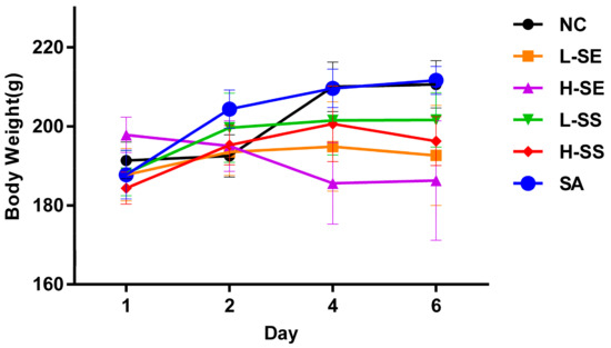 The normal control group exhibited normal growth throughout the study while the decreases on body weight were found in the rats treated with the SE in both doses (L-SE and H-SE). The rats in the L-SE and H-SE groups had significant reductions on the mean body weight especially at day 4 (p = 0.006, p < 0.001) as well as at day 6 (p = 0.001, p < 0.001), respectively. There was a slight decrease in the growth of the rats treated with both doses of the SS without a statistical difference. No influence was found in the rats treated with the SA (Figure 2).