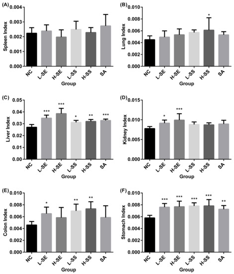 For the colon, all the treatments resulted in an increased colon index (Figure 3E). However, the statistical significance difference was shown in group L-SE and SS on both. The increase was 41.88% in the L-SE (p = 0.031), 51.82% in the L-SS (p = 0.005) and 59.62% in the H-SS (p = 0.001). The H-SE and SA had an influence with an increase around 27% without statistical significance.