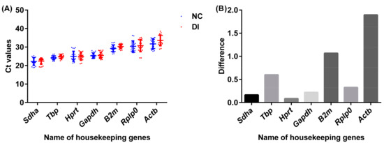 mRNA expression levels of seven housekeeping genes in normal and diarrhea-rat organs including colon, kidney, stomach, spleen, and liver. The expression was detected in 60 ng of RNA by using qRT-PCR. (A) Graphical representation of absolute Cq values for each gene analyzed in tissues collected from the normal rats (NC) and diarrhea-rats (DI) induced by senna extract. (B) The difference of mean Cq values for each gene between the normal rats and the diarrhea-rats. A line across the box depicts the median. Whiskers represent the maximum and minimum values.