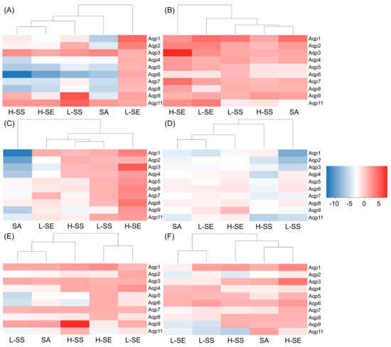In the kidneys, there were minor alterations in the SA and SS groups, but there were major alterations in the SE groups. Up-regulations with most of the Aqps were found in the SE in both groups (Figure 6B). The dose-dependent manner was shown on Aqp3 and Aqp7 in group H-SE with the fold changes at 13.35 and 4.56 times, respectively.