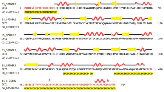 Prediction of the secondary structure of hDKC1 was done using the SPIDER2 secondary structure prediction server (available online: http://sparks-lab.org/server/SPIDER2). SPIDER2 applies deep neural networks to secondary structure prediction, where deep neural networks refer to neural networks with more than two hidden layers [44]. To study the disordered regions, the DISOPRED server was used (http://bioinf.cs.ucl.ac.uk/web_servers/disopred/disopred_overview/). This server allows the estimation of the probability of each residue in the sequence of being disordered [45].