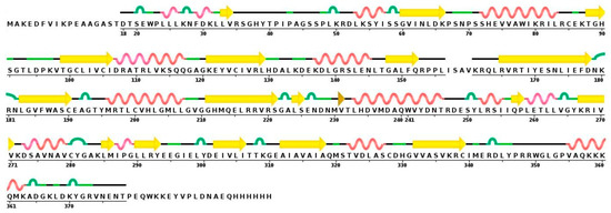 As shown in Figure 2, the predictions obtained using the HHPred server (Homology detection by Hidden Markov modes Prediction) revealed that the secondary structure of hDKC1 contains 26.85% α-helices, 10.51% β-strands, and 62.65% loops. Both N- and C-terminals showed a disorganized structure. Regarding this feature, it was reported that the unique function of residues 1 to 21 is to act synergistically with the C-terminal nuclear localization sequence (NLS) to ensure dyskerin nucleolar localization. Likewise, the biological relevance of the C-terminal region (390–514 aa) is supported by the presence of a bipartite NLS and of several potentially modified residues [6]. These observations could explain the unstructured organization of this region, which is highlighted in yellow in Figure 2.