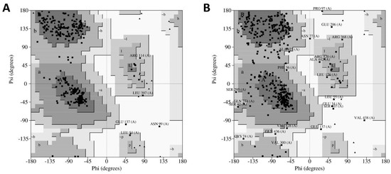 The stereochemical quality of the obtained models was verified using PROCHECK (available online: https://www.ebi.ac.uk/thornton-srv/software/PROCHECK). This software corroborates the quality of a protein structure, producing a number of PostScript plots analyzing its overall and residue-by-residue geometry [12].