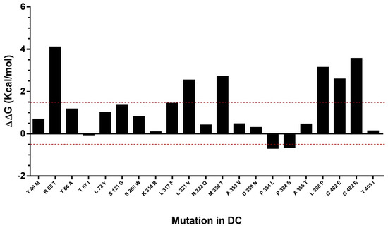 Analysis of mutation stability in the hDKC1 model by Foldx software. Mutations comprised between red dashes lines (−0.5 Kcal/mol to 1.5 Kcal/mol) correlates with the mutations that are not destabilizing. DC = dyskeratosis congenita.