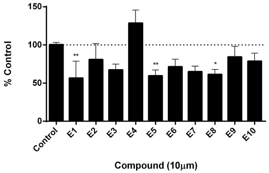 The human mammary adenocarcinoma cell line MDA MB 231 was obtained from the American Type Culture Collection (ATCC® HTB-26™). Cells were grown in Dulbecco’s modified Eagle’s medium (DMEM) (Thermo Fisher Scientific, Walthman, MA, USA 02451) supplemented with 10% heat-inactivated fetal bovine serum (FBS) (Sigma, St. Louis, MO, USA), 2 mM glutamine and 80 µg/mL gentamicin at 37 °C in 5% CO2 atmosphere. Cell cultures were routinely sub-cultured by trypsinization using standard procedures. Cells were treated for 48 h with each compound at a concentration of 10 µM for compounds 1, 2, 3, 4, 5, 6, 7, 8, 9, 12 and 13 and 2 µM for compounds 10 and 15. Dimethyl sulfoxide (DMSO) was used as vehicle.