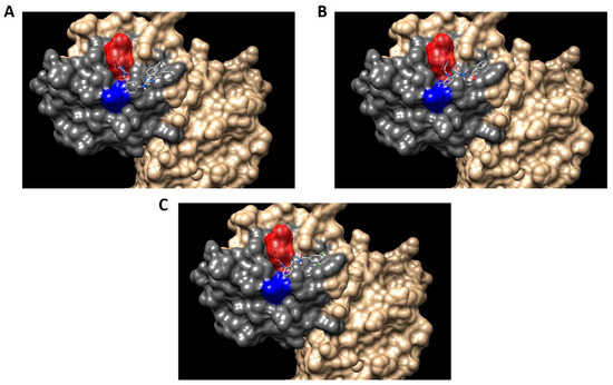 Spatial arrangement of the resulting compounds in the hDKC1 3D structure model. hDKC1 is colored in beige Residue K314 is indicated in blue, the PUA domain is colored in dark gray and Pocket 13 is highlighted in red. (A) E1; (B) E5; (C) E8.