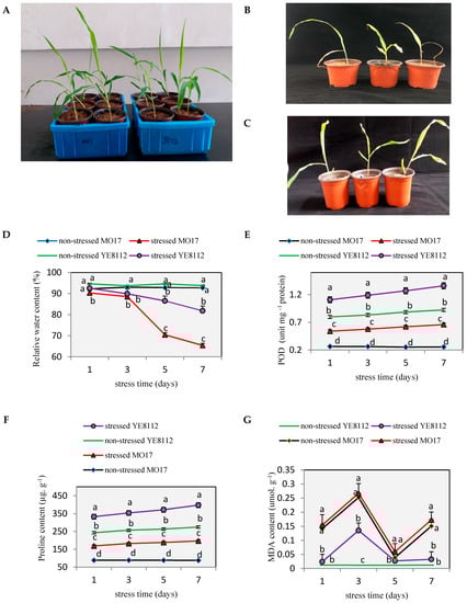 Phenotypic (A–C) and physiological (D–G) responses of two maize inbred lines to drought stress. Phenotypic displays presented here are for three-leaf-stage seedlings after 7 days of moisture deficit treatment. (A) MO17 and YE8112 inbred lines under non-stressed (water-sufficient) conditions; (B) sensitive line MO17 drought stressed; (C) tolerant line YE8112 drought stressed; (D–G) physiological changes were measured in leaf tissues at different stress exposure periods/time points (1, 3, 5, and 7 days); (D) leaf relative water content, (E) peroxidase (POD) enzyme activity, (F) proline content and (G) level of lipid peroxidation (MDA (malondialdehyde) content). Data are presented as the mean ± standard error (n = 3). Different letters above line graphs show significant difference among treatments at a given day of treatment (p ≤ 0.05).