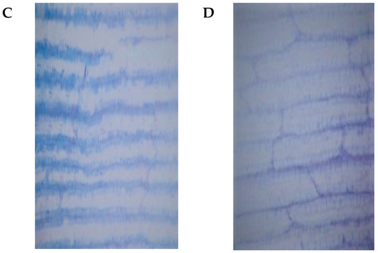 Drought stress significantly (p < 0.05) decreased the leaf relative water content (RWC) from day 1 in MO17, and from day 3 in YE8112 (Figure 1D). This shows that, upon exposure to drought stress, the sensitive line MO17 lost leaf water significantly quicker than tolerant line YE8112. Moreover, the RWC of YE8112 was higher than that of MO17 in water-deficit conditions (Figure 1D); these results corresponding to our visual observation. Further, the RWC change in the sensitive line MO17 was evidently higher than that of the tolerant line (Figure 1D), which indicates that the tolerant line YE8112 had higher water retention capacity than sensitive line MO17. The POD activity showed an increasing trend, in pace with increasing number of treatment days (Figure 1E). This indicates that certain drought stress intensity could result in increased production and activity of antioxidant enzymes and protective osmolytes in maize seedlings leaves. The proline content was significantly (p < 0.05) increased in both MO17 and YE8112 upon drought stress exposure, commencing from day 1 in both inbred lines (Figure 1F). Additionally, the proline content was generally higher in YE8112 than in MO17 at most time points under stress conditions (Figure 1F). Results on leaf malondialdehyde (MDA) content showed that overall; it was significantly higher in MO17 than in YE8112 under both stressed and non-stressed conditions. In both inbred lines, MDA content showed an increasing trend, until the third day, and then declined significantly thereafter (Figure 1G). From the fifth day onwards, MDA content exhibited a gradual decline or a uniform level in MO17 and YE8112, respectively (Figure 1G). This may suggest that with the increase of stress exposure period, leaf cell membranes are severely injured, ultimately leading to membrane lipid release and destruction of membrane structures. Trypan blue staining results indicated that under control conditions, leaf cells of both inbred lines remained intact and viable, hence, unstained (Figure 2A,B). However, post drought exposure, sensitive line MO17 had lower active cells and cell membranes were significantly damaged (Figure 2C). In contrast, tolerant line YE8112 still had more active cells (Figure 2D).