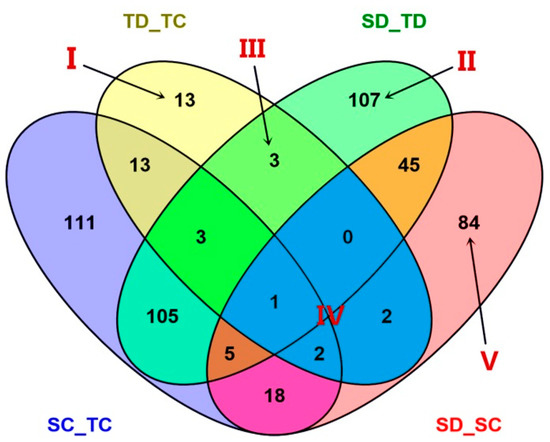 Venn diagram analysis of differentially abundant proteins (DAPs) identified in the four experimental comparisons. The overlapping regions of the Venns indicate the DAPs shared between/among corresponding groups. Area I represents 13 drought responsive DAPs specific to TD_TC; Area II represents 107 DAPs exclusive to SD_TD; Area III shows the 3 DAPs specifically shared between TD_TC and SD_TD; Area IV shows the five overlapping DAPs within line (shared between TD_TC and SD_SC); Area V shows 84 DAPs exclusive to SD_SC comparison.