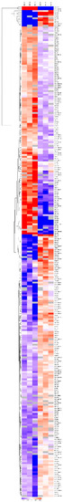 Clustering analysis of differentially abundant proteins (DAPs) in SD_TD comparison. Each row represents a protein significantly abundantly expressed. First three columns refer to technical replicates (MD1–3) for MO17 drought stressed, whilst the last three columns (8D1–3) refer to replicates for YE8112 drought stressed. The scale bar on the X-axis indicates the logarithmic value (log 2) expression of the DAPs, up-regulated (red) and down-regulated (blue).
